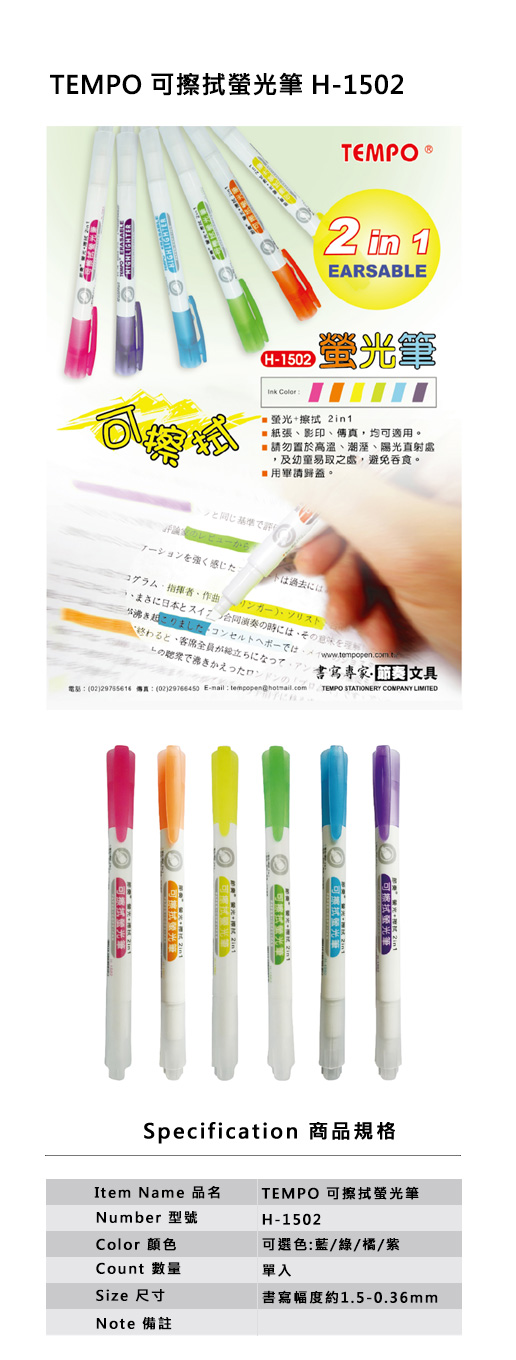 *TEMPO 可擦拭螢光筆 H-1502