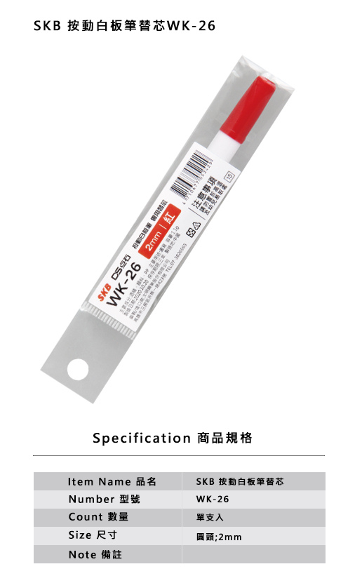 SKB按動白板筆替芯WK-26(紅色)