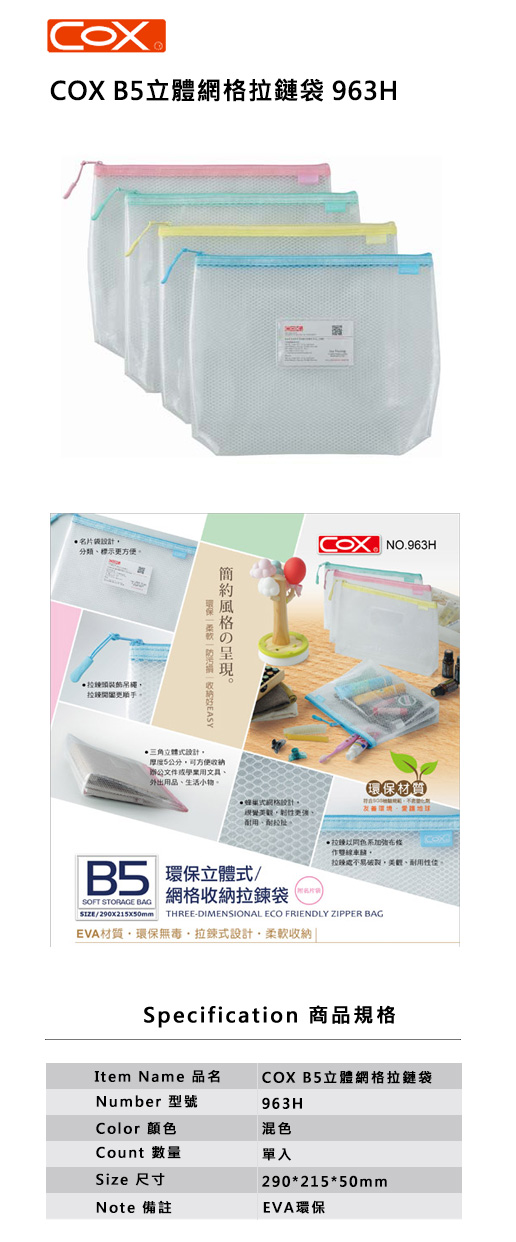 COX B5立體網格拉鏈袋963H